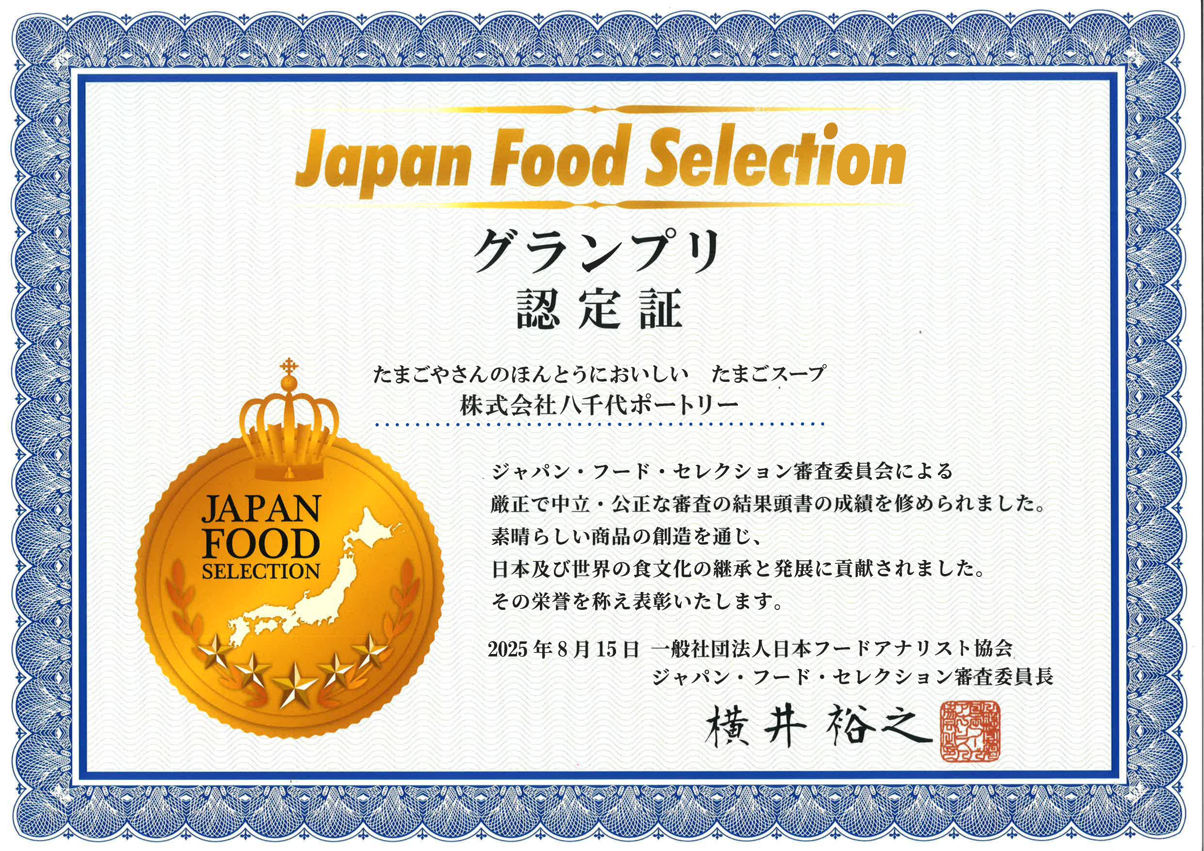 2025年8月15日に、ジャパン・フード・セレクションの食品・飲料部門にて、弊社のたまごスープが、4段階評価の内の最も高い評価である「グランプリ」を受賞しました!